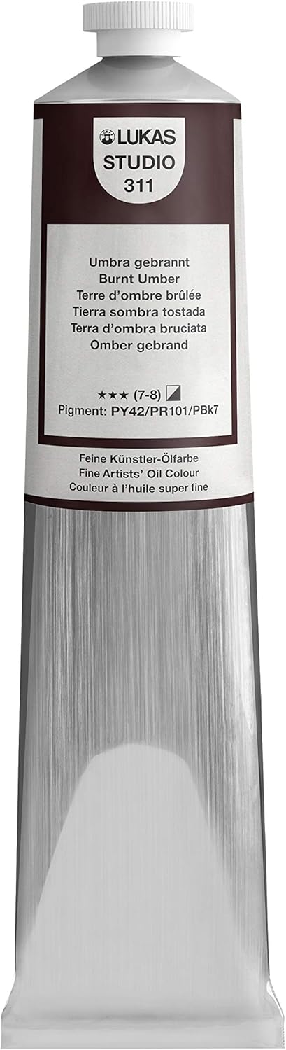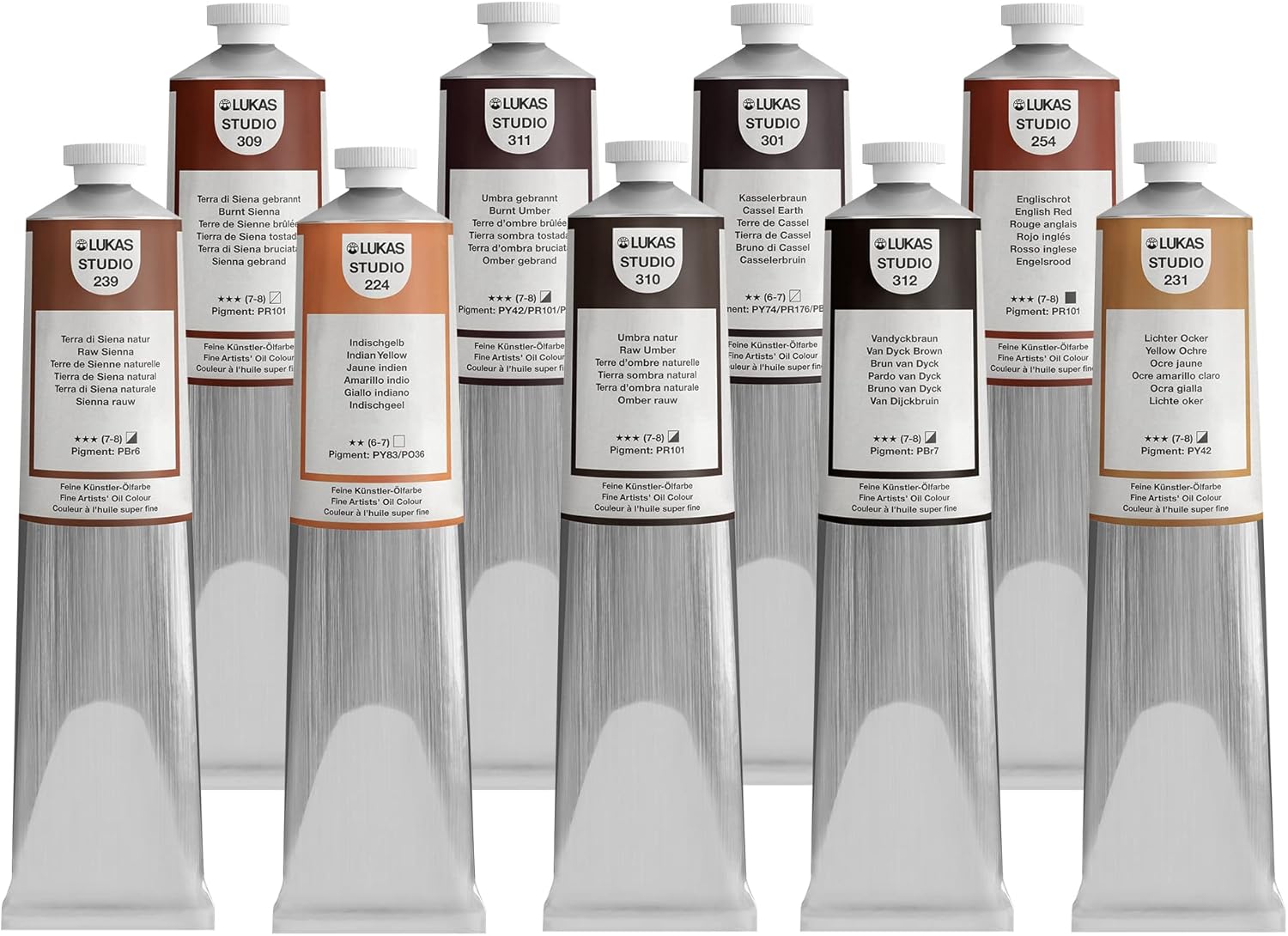 Studio Oil Fine Artists’ oil colour, the modern premium quality with an optimized price performance ratio, is suitable for the demanding artist and student. The oil colours contain only brilliant and valuable pigments with a high light fastness in high concentration. LUKAS Studio Oil Fine Artists’ oil colour, the modern premium quality with an optimised price performance ratio, is ideally suitable for the demanding artist and student. The oil colours contain only brilliant and valuable pigments with ahigh lightfastness in high concentration, for an exceptional colour intensity and opacity. A dash (0,5-1,5 Percent) of the finest bleached beeswax as one of the ingredients gives the colour the famous buttery and short consistency and makes the colour-film less brittle for the restorer. The binders are, as in all LUKAS oil assortments, only pure vegetable linseed and sunflower oils in special quality. Sunflower oil is used in the manufacture of pale shades to greatly reduce the traditional «yellowing» that occurs when made with linseed oil. Moreover a good and even drying of the colours is guaranteed and the risk of cracking of the surface while the colours are drying is minimised, when used properly. The production of these colours is finalised through the traditional three roll mills. The typical drying time for oil colours straight through all shades amounts on average from 2 to 4 days with thin brush stroke strength of 100 to 120 μm. The 12 colour tubes included in the set offer the ideal opportunity to work in the area of the creative-artistic oil painting. The range allows painting directly from the tube with a fine nuance. LUKAS Studio Oil colours can be used on various painting surfaces, whether on canvases, painting or wooden boards. It is recommended to use a pre-treated painting surface, which is isolated due to its primer, preventing the binder from being absorbed and the colour losing its shine.