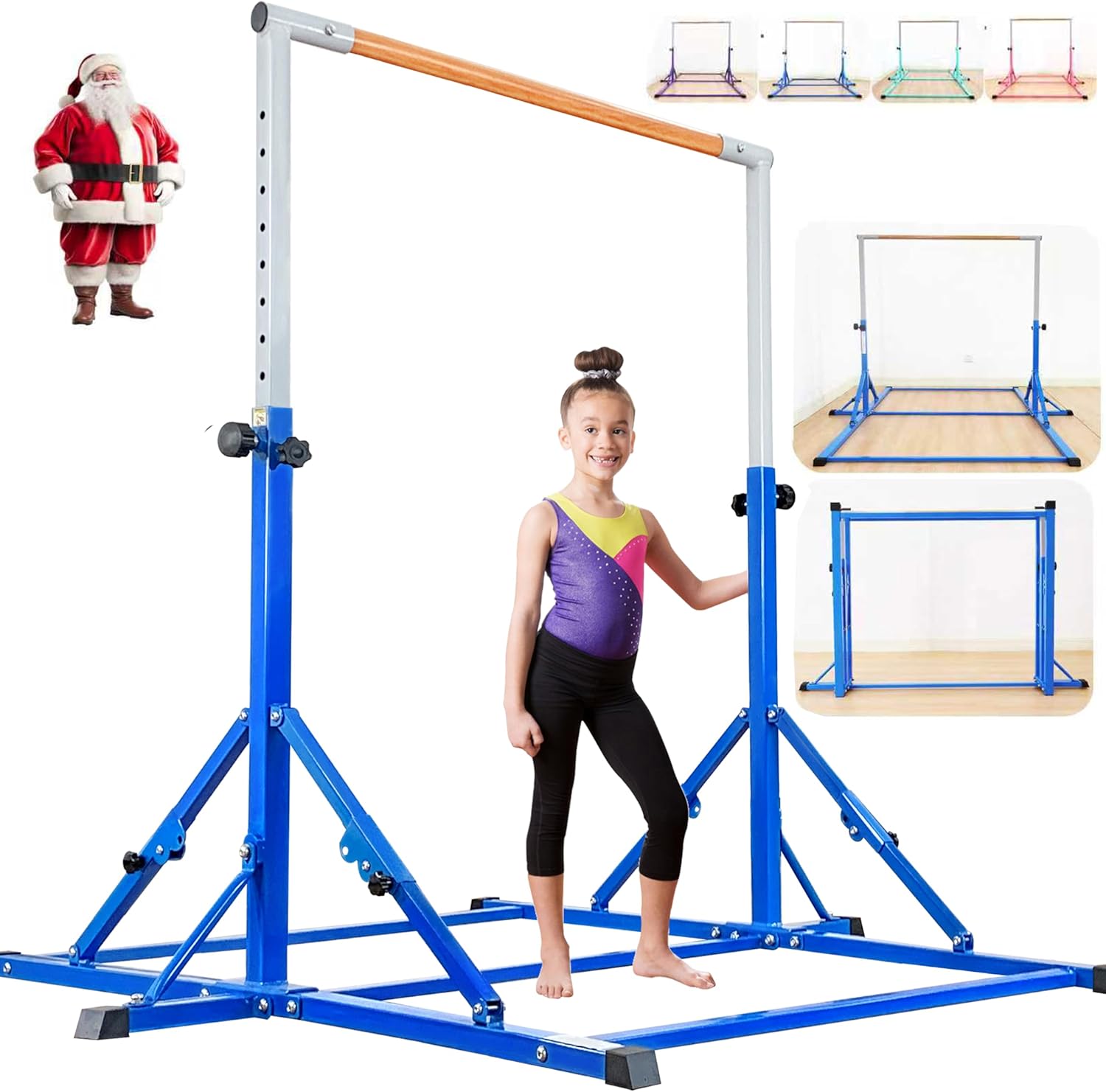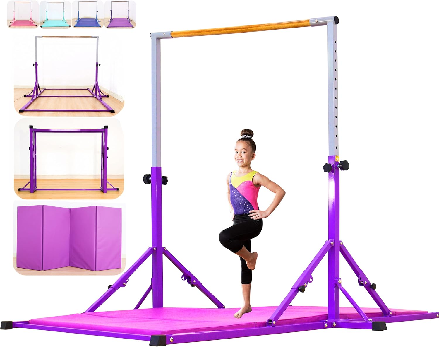 1. After Services: ONE year free repair and life time maintenance. / 2. Gymnastics bar have 4 Color Choice: pink, purple, blue, teal. / 3. Height: adjustable, from 36 inch to 59 inch, there is SCALE VALUE on ADJUST ARM, no need ruler to check exactly height, More Convenient. / 4. Inner Width of gymnastics bar is 4 ft, most popular size for kids to do exercise. / 5. Crossbar Material is fiberglass, more durable and more flexible. / 6. Adjust Arm is made of REAL 304 Stainless Steel, all life No Rust & No Scratch. / 7. This type of gymnastics bar comes with 4 units Ground Pegs and 8 units Suction Cups. You could use them to fix the bar base when you use it to increase stability. / 8. This gymnastics bar Structure makes total system REAL easily assemble, Real easily move and Real Easily storage, super easy to move it from one room to another room, or from indoor to outdoor, or carry to park.