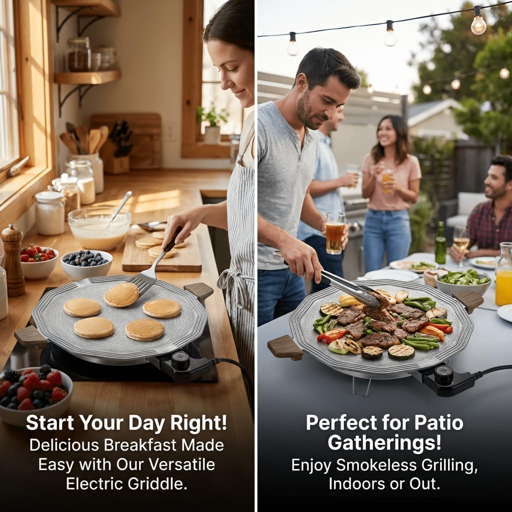 Elevate your home cooking experience with this premium electric skillet, designed for those who appreciate both style and performance. Featuring a superior textured non-stick surface, this griddle ensures effortless food release and simple cleanup, while its intricate heat distribution design guarantees perfectly even cooking from edge to edge. The removable precision temperature control offers adjustable settings from low to high, giving you complete command over a wide range of recipes—from delicate pancakes to seared steaks. With a large capacitycooking surface, it’s ideal for preparing family-sized breakfasts, weekend brunches, or festive holiday dinners. The elegant wood-look handles add a touch of sophistication, while the foldable stand allows for compact storage. Designed for rapid heating and versatile cooking, this skillet is your go-to solution for effortless meals, whether it’s a cozy Thanksgiving feast, a Super Bowl party, or a quick weeknight dinner. Perfect for gifting during the holiday season, this kitchen essential combines functionality, style, and convenience for every home chef.