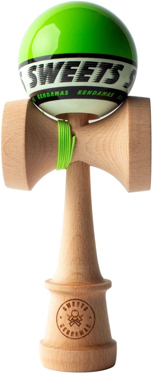 Sweets Kendamas Basic Series SWEETS STARTER The Ken is the Amped shape and is larger than the previous Boost shape and the diameter of the ball is slightly larger from 61mm to 62mm. The ball is painted with a sticky paint and the markings on the ball thread holes are white so it is highly visible. Built-in bearing.